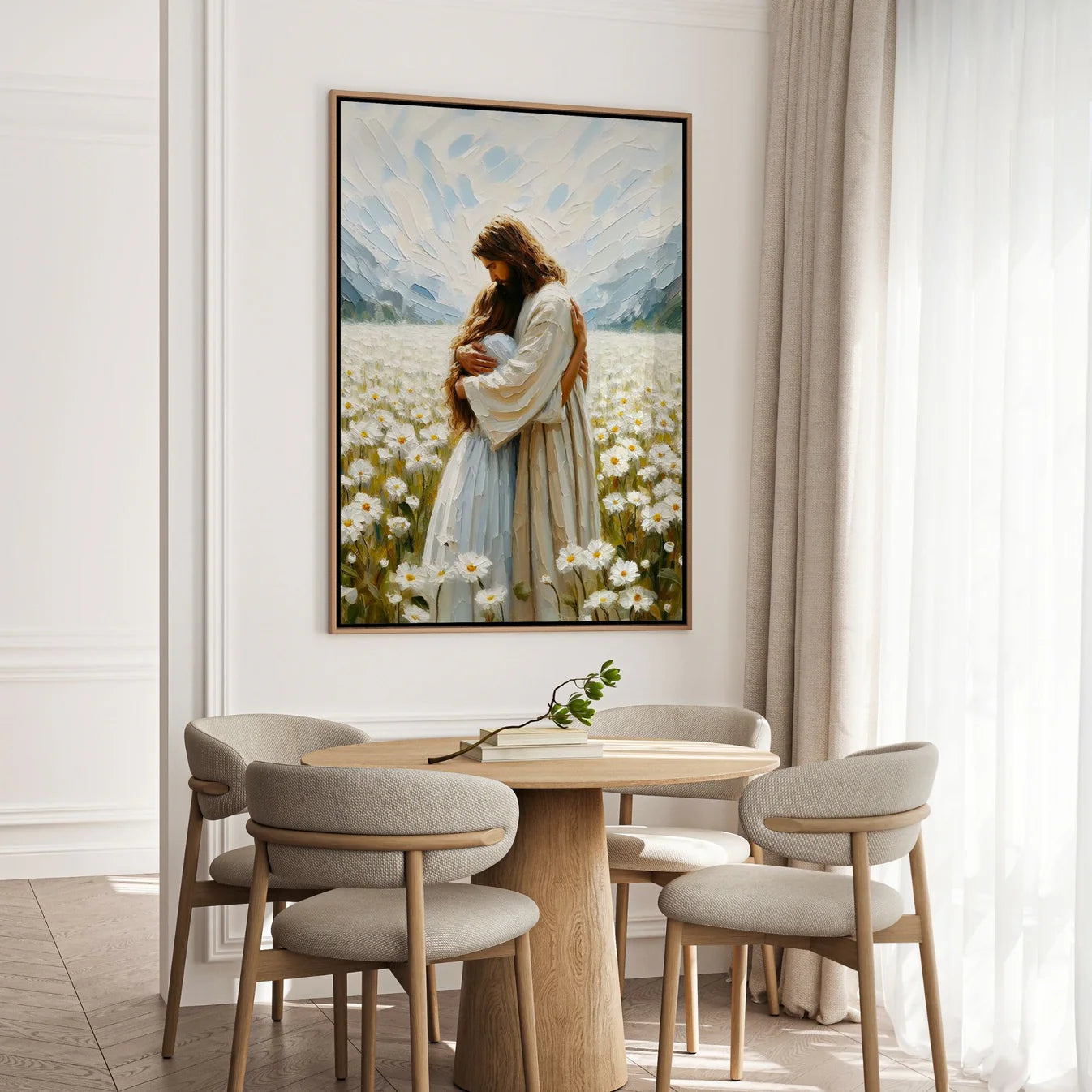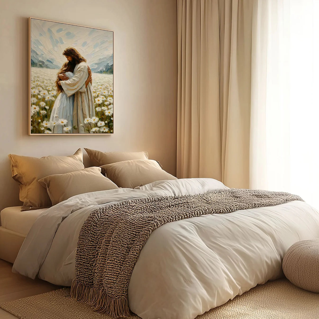 Inspired by His endless grace, this artwork captures the most comforting truth—Jesus embraces you fully, just as you are. The woman in His arms represents all of us, broken, weary, yet deeply loved. No burden is too heavy, no past too stained—His love is always waiting for you. Let this canvas be a daily reminder that you are never alone, never forgotten, and forever held in His love.