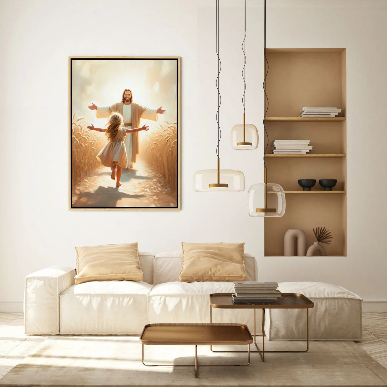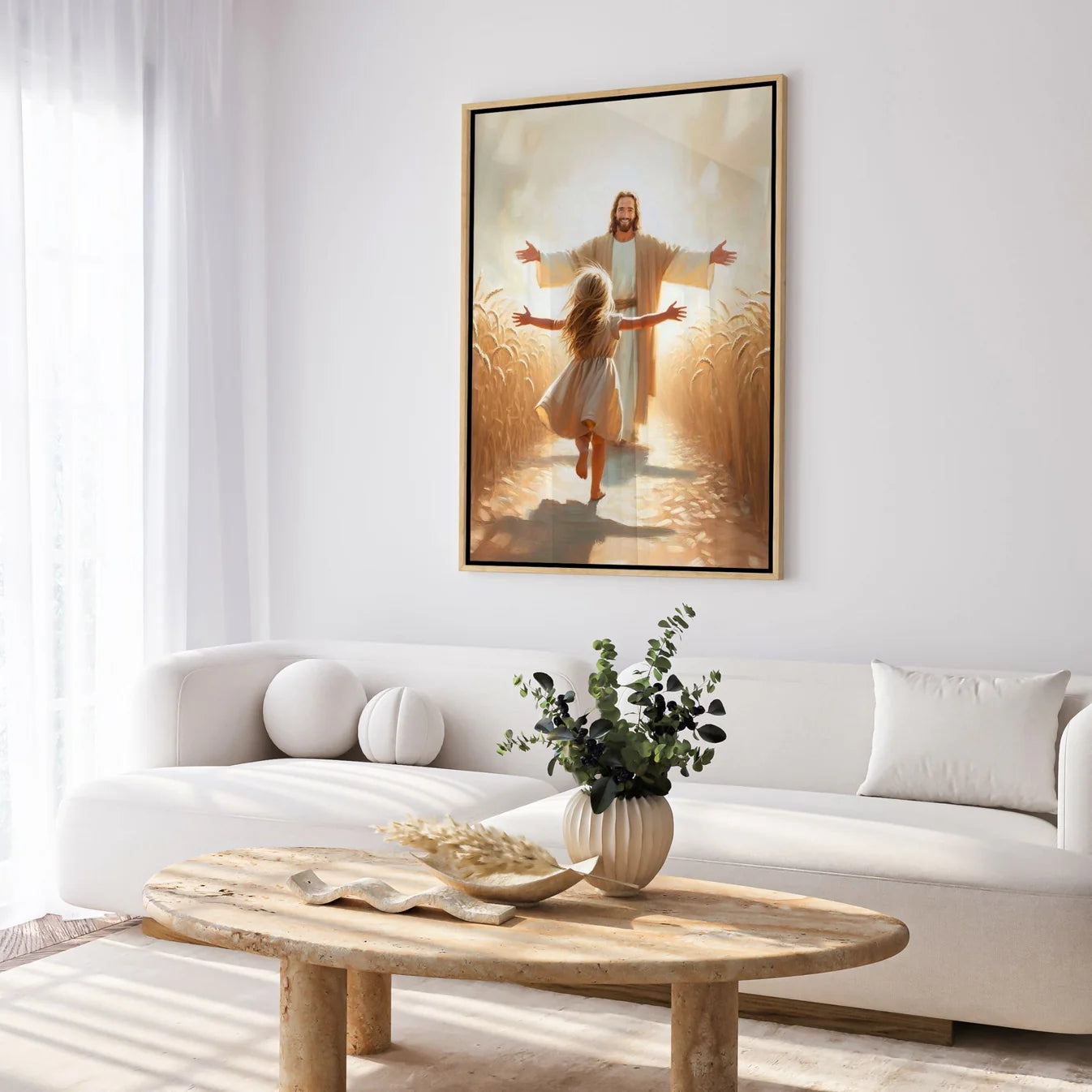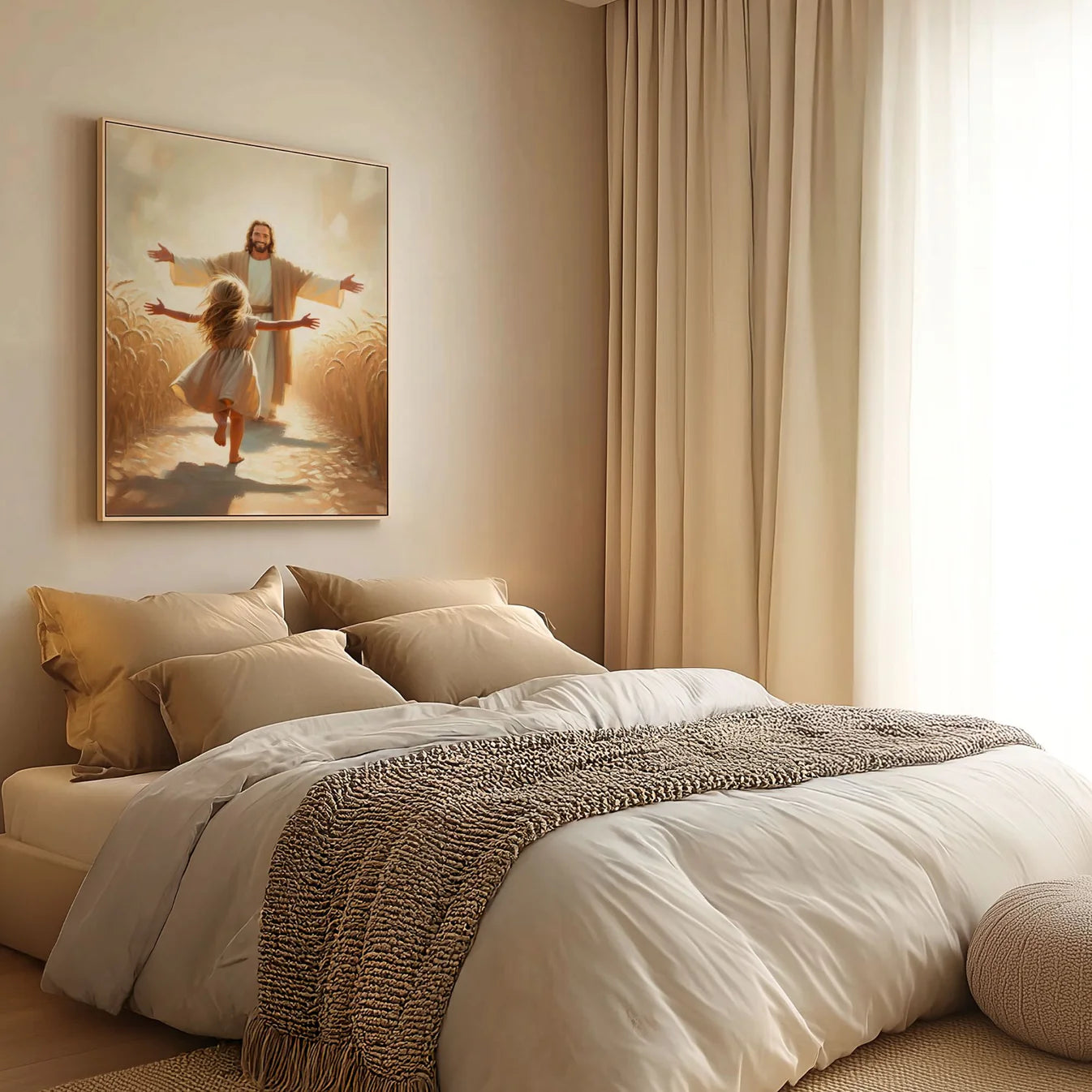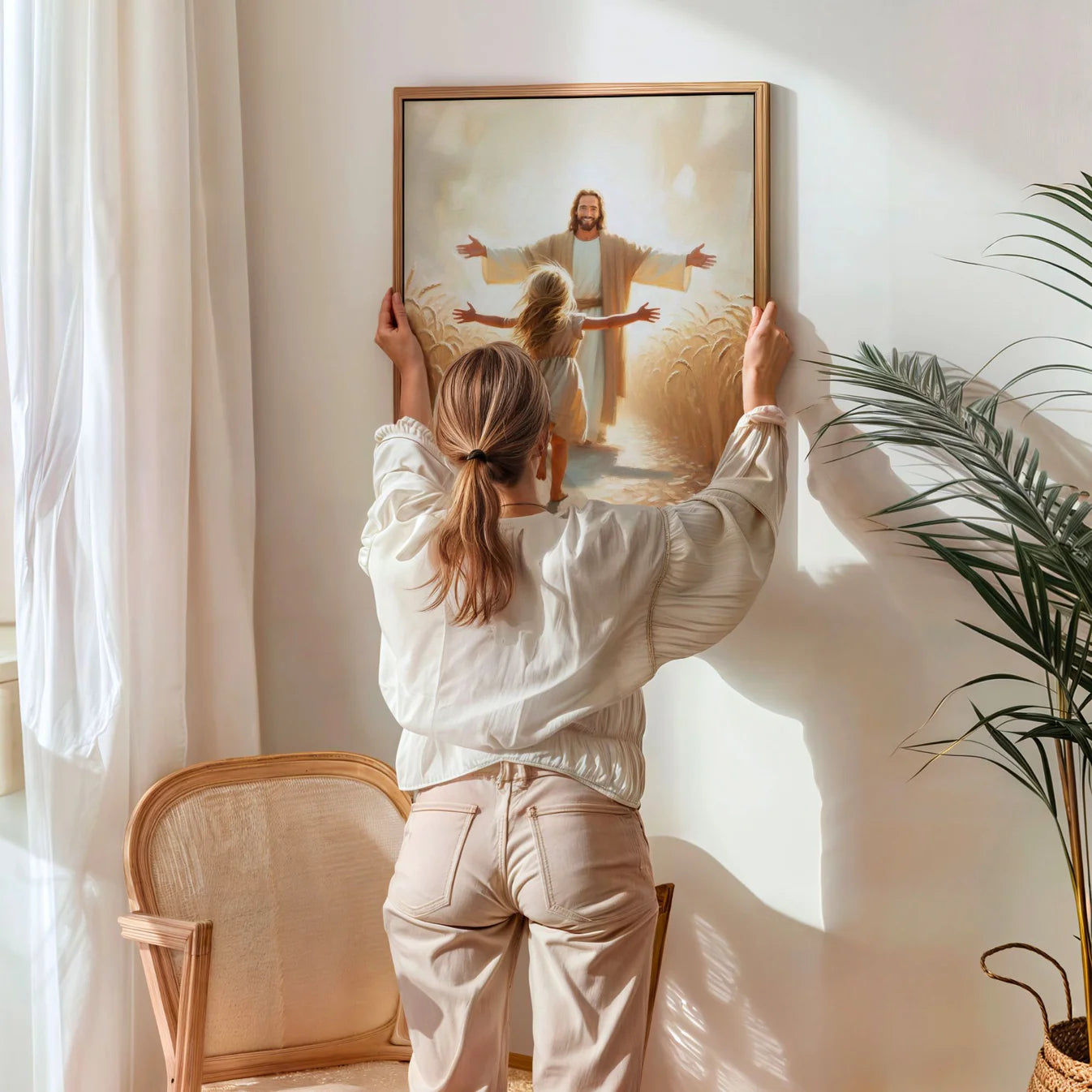 This powerful canvas captures the pure joy of running into the arms of Jesus—a child taking a bold leap of faith, knowing He is always there, waiting with open arms. No fear, no hesitation—just trust, love, and the promise that He will never let go. A beautiful reminder that faith is not about how strong we are, but how strong He is. Whether for a child’s room, a prayer space, or a meaningful gift, this piece brings warmth, peace, and the reassurance of His unfailing love.