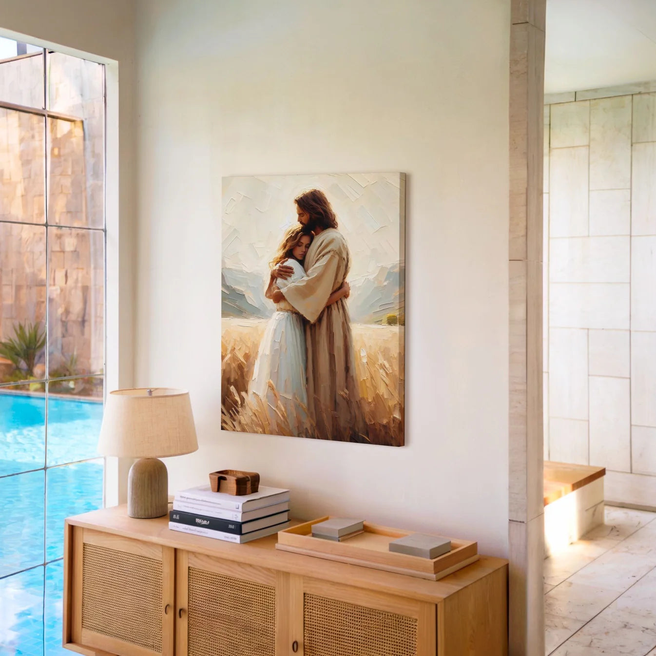Inspired by His endless grace, this artwork captures the most comforting truth—Jesus embraces you fully, just as you are. The woman in His arms represents all of us, broken, weary, yet deeply loved. No burden is too heavy, no past too stained—His love is always waiting for you. Let this canvas be a daily reminder that you are never alone, never forgotten, and forever held in His love.