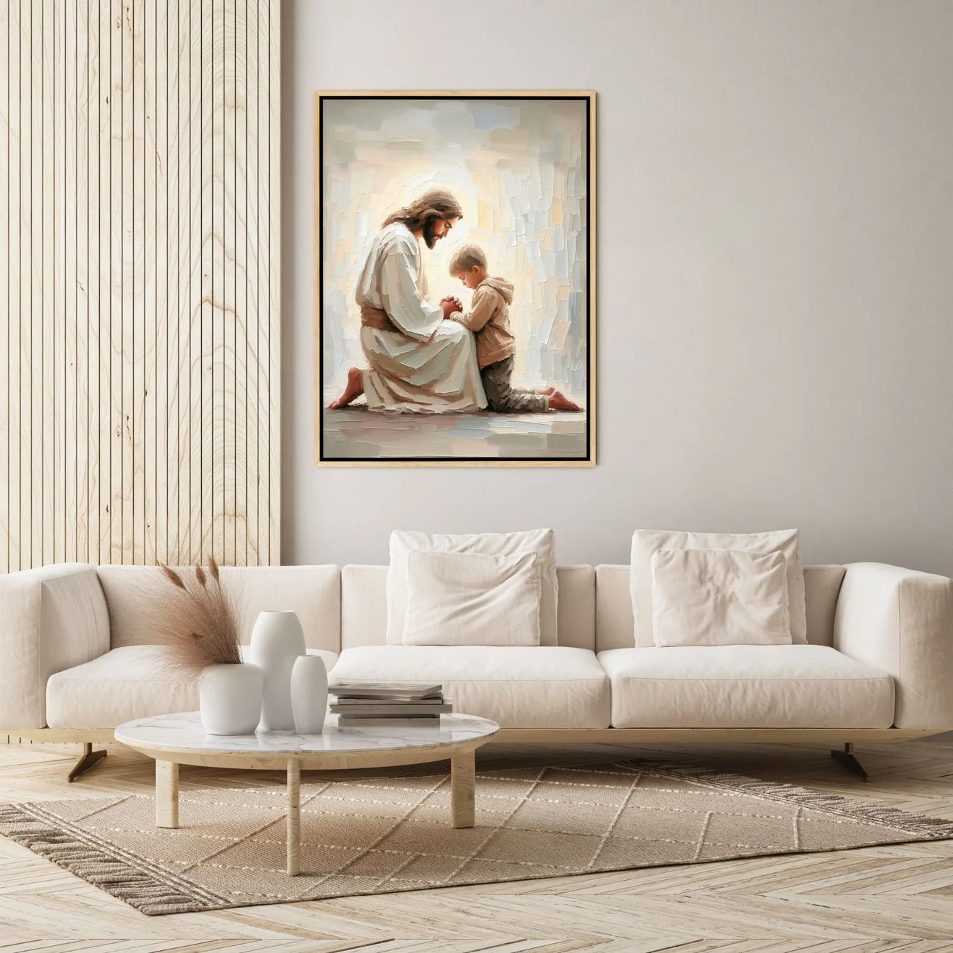 This heartwarming canvas captures the purest moment of faith—a little boy kneeling in prayer infront of Jesus. Hands folded, eyes closed, he prays with the One who listens, comforts, and loves unconditionally. A daily reminder that Jesus is near, guiding, protecting, and hearing every whispered prayer. Whether for a child’s room, a prayer space, or a gift of faith, this piece brings peace, warmth, and His loving presence into any home.