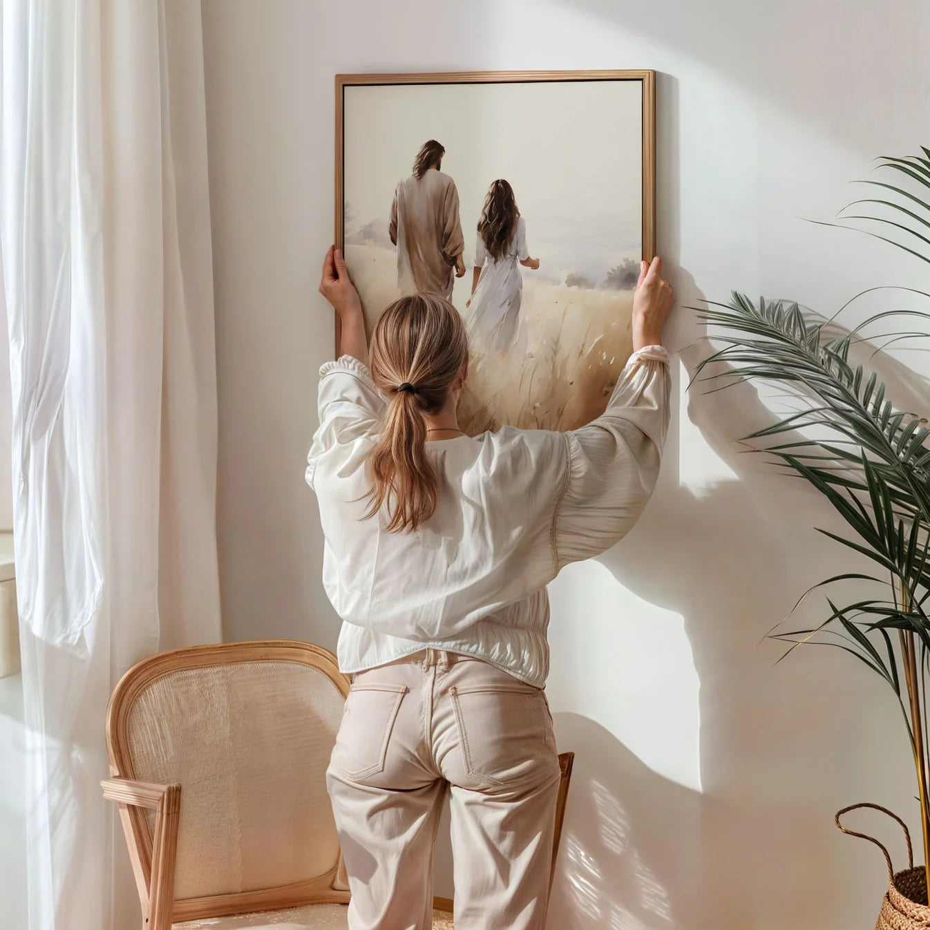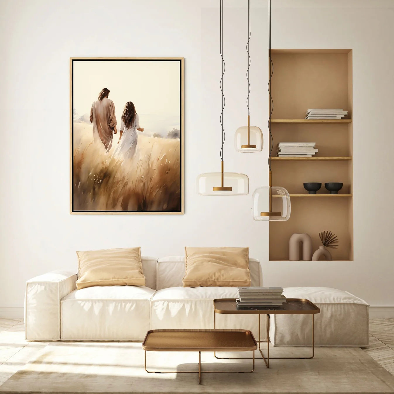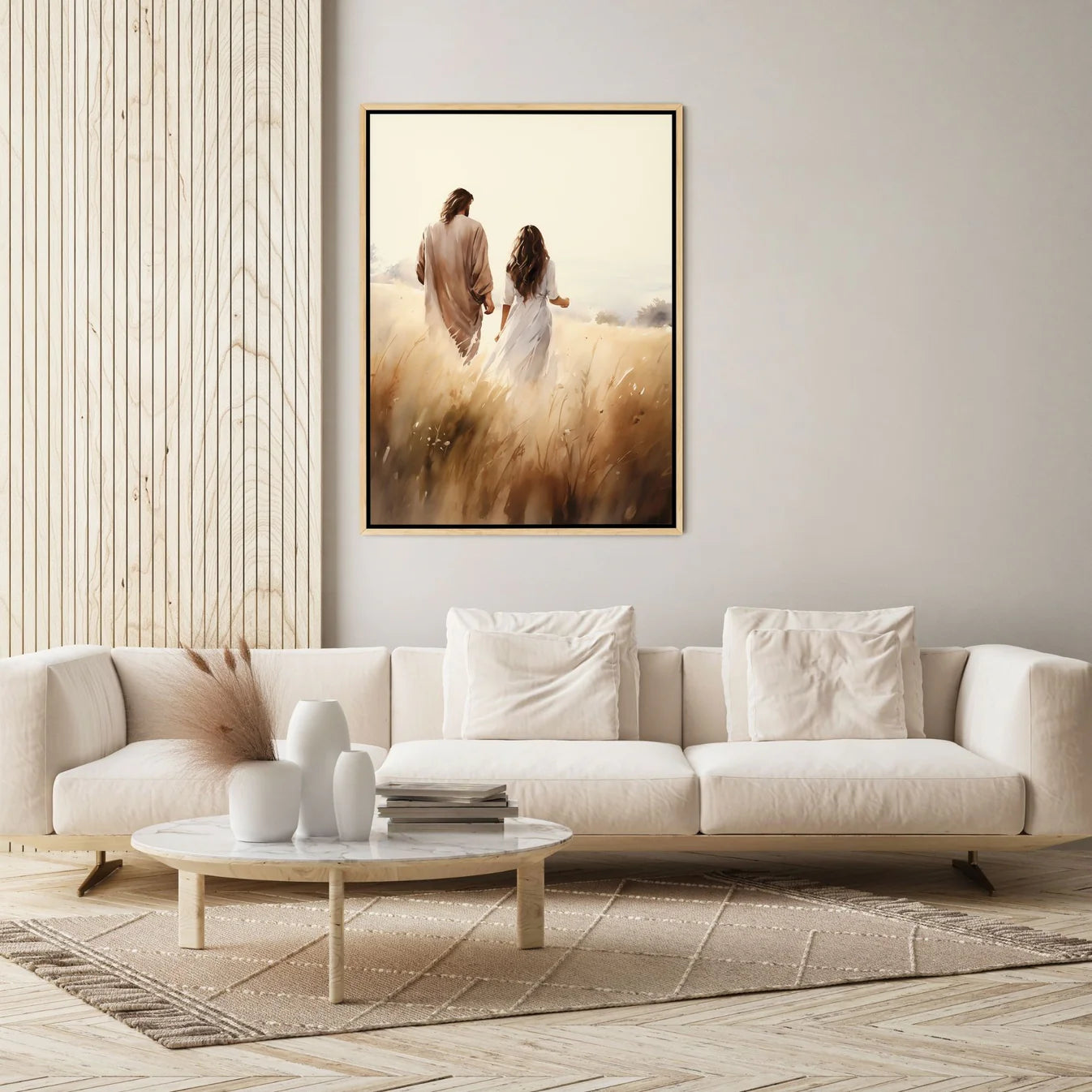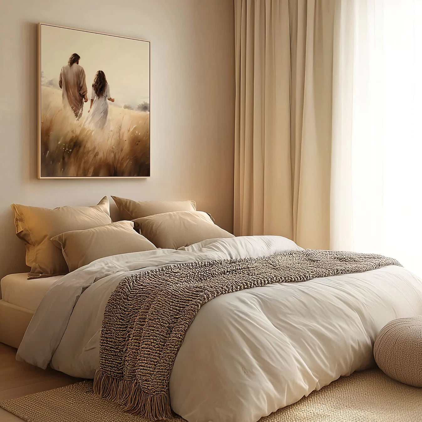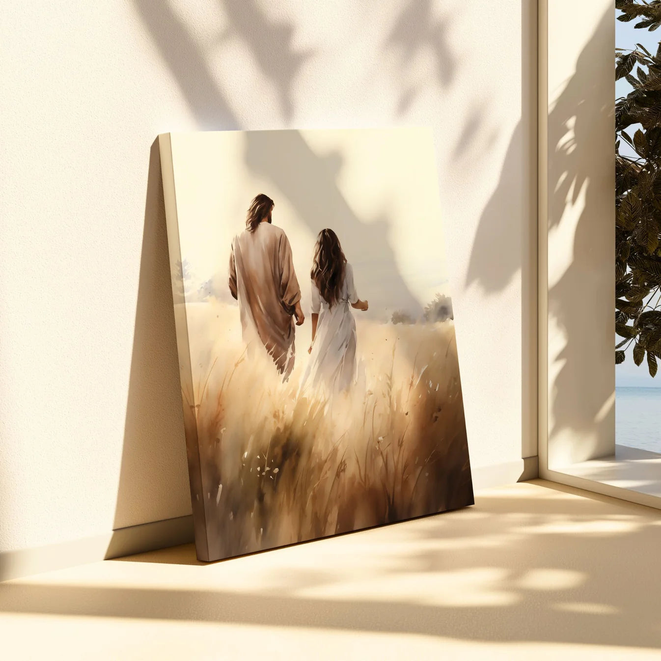 This artwork beautifully captures Jesus walking hand in hand with a woman, a symbol of His constant presence and unwavering love. Through every season—joy, sorrow, doubt—He never leaves your side. No matter where life takes you, His hand is always there, guiding you forward in grace. Let this piece be a daily reminder that you are never walking alone—He is with you, step by step.