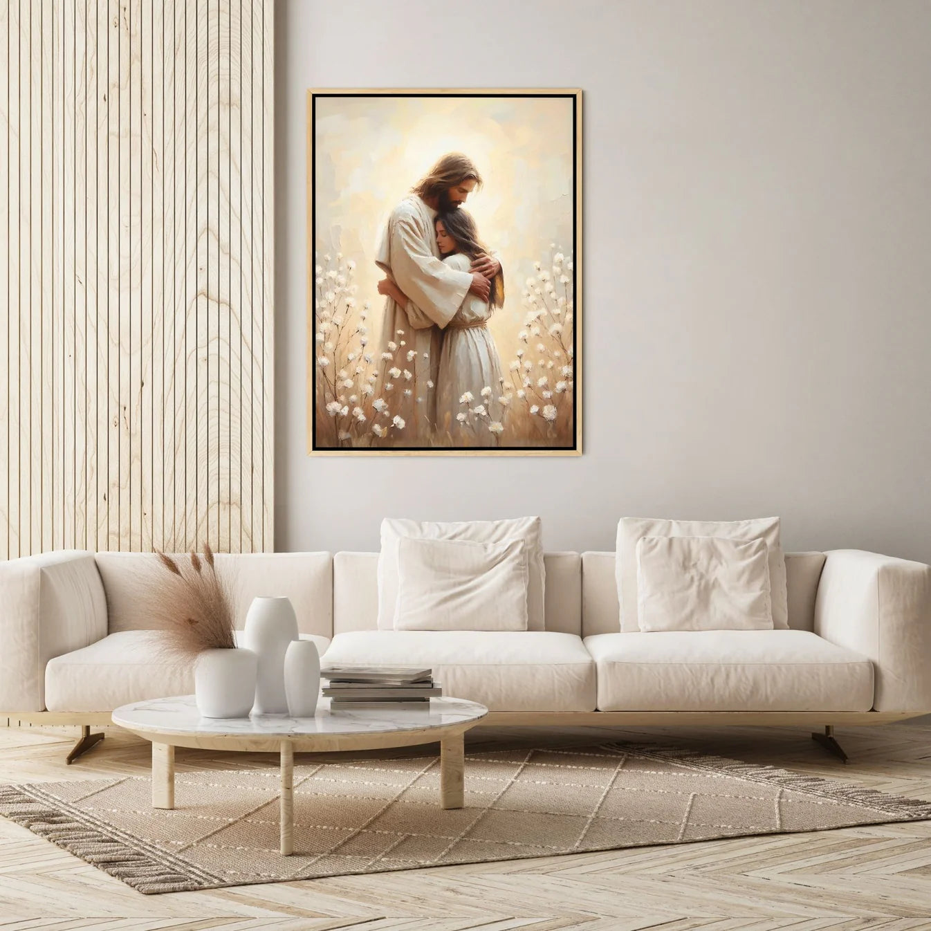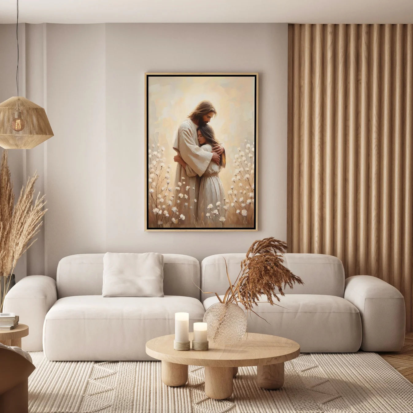 Inspired by His endless grace, this artwork captures the most comforting truth—Jesus embraces you fully, just as you are. The woman in His arms represents all of us, broken, weary, yet deeply loved. No burden is too heavy, no past too stained—His love is always waiting for you. Let this canvas be a daily reminder that you are never alone, never forgotten, and forever held in His love.